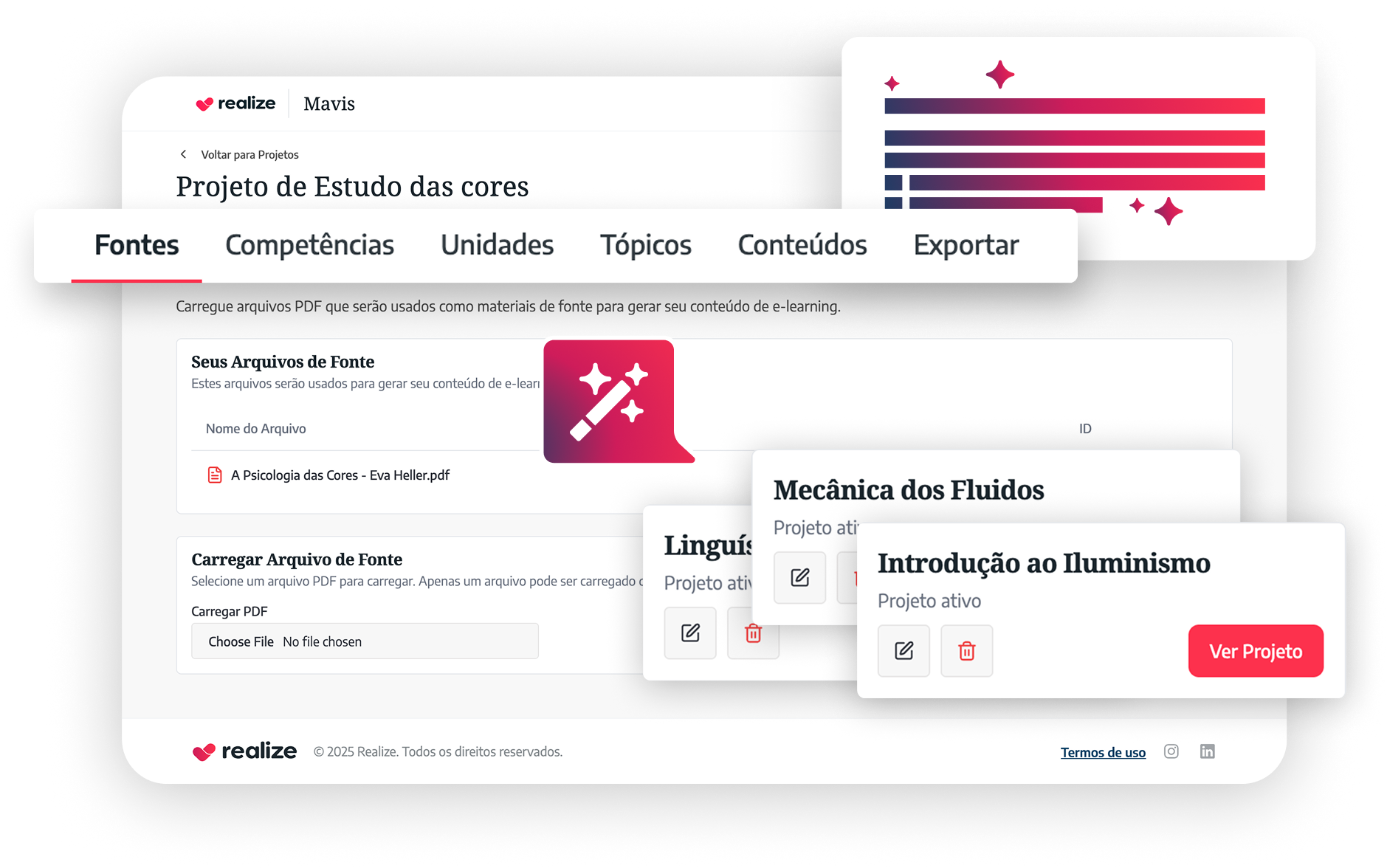 Ferramenta de autoria voltada à criação de conteúdos didáticos interativos, acessíveis e compatíveis com qualquer LMS, a Realize permite escalar a produção de maneira ágil sem perder a qualidade. Seu gerenciador de projetos ajuda a organizar disciplinas, acompanhar entregas, gerar relatórios e delegar tarefas, garantindo que a IES tenha total controle sobre o material produzido.